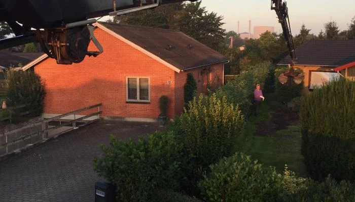 Arbejdet med at få kørt materialer fra indkørslen og om i bedene i haven kan være meget tungt og tidskrævende og sidst, men ikke mindst, så kan det være hårdt for arealerne. Som den nyanlagte græsplæne, der kan tage skade, når den skal forceres mange gange med en tungt lastet trillebøre eller vogn. Derfor kan der være mange gode argumenter for at få flis eller jord lagt om i bedene med en kran. Vores chauffører er dygtige og erfarne og de arbejder med centimeter-præcision!